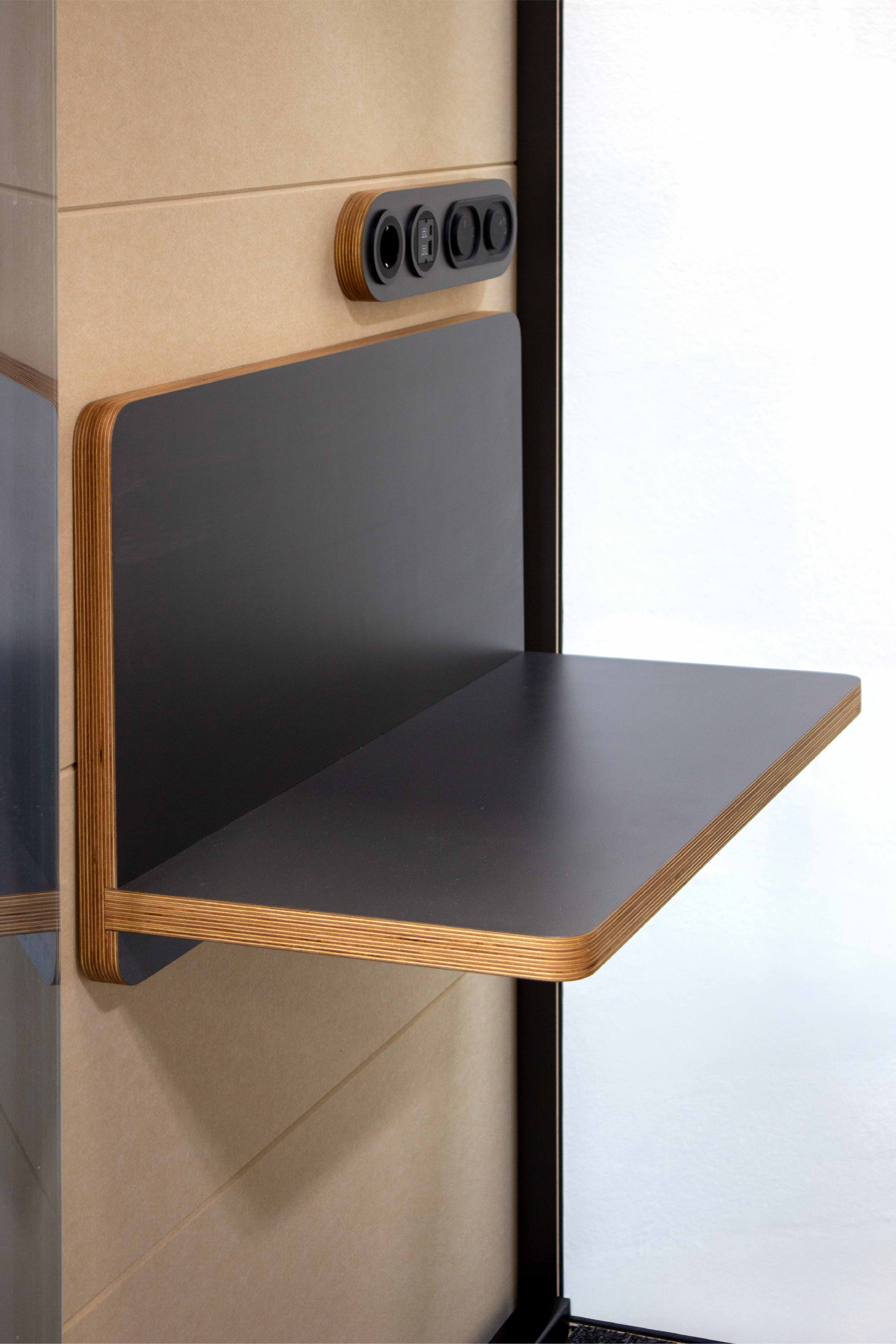Incluye una mesa regulable en altura que permite trabajar de pie o sentado, iluminación LED directa e indirecta y un sistema de ventilación de alto rendimiento. El sensor de presencia activa automáticamente la luz y la ventilación, que continúan funcionando unos minutos tras salir para renovar completamente el aire.