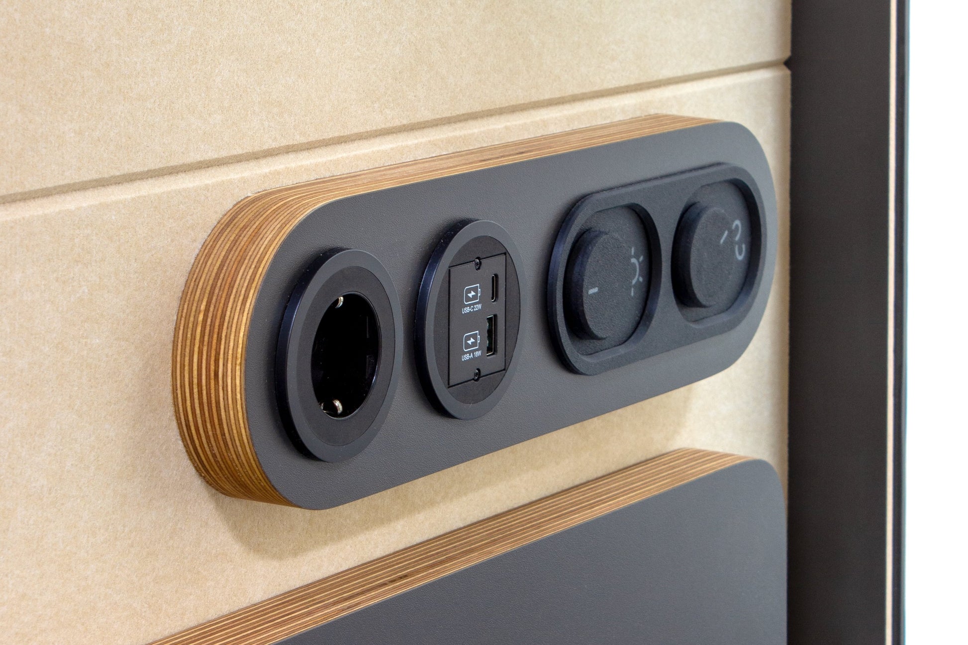 La cabina cuenta con panel de control con doble regulador para ajustar luz y ventilación, tomas eléctricas con USB-A y USB-C según el estándar del país, y puerta disponible en apertura DIN izquierda o derecha.